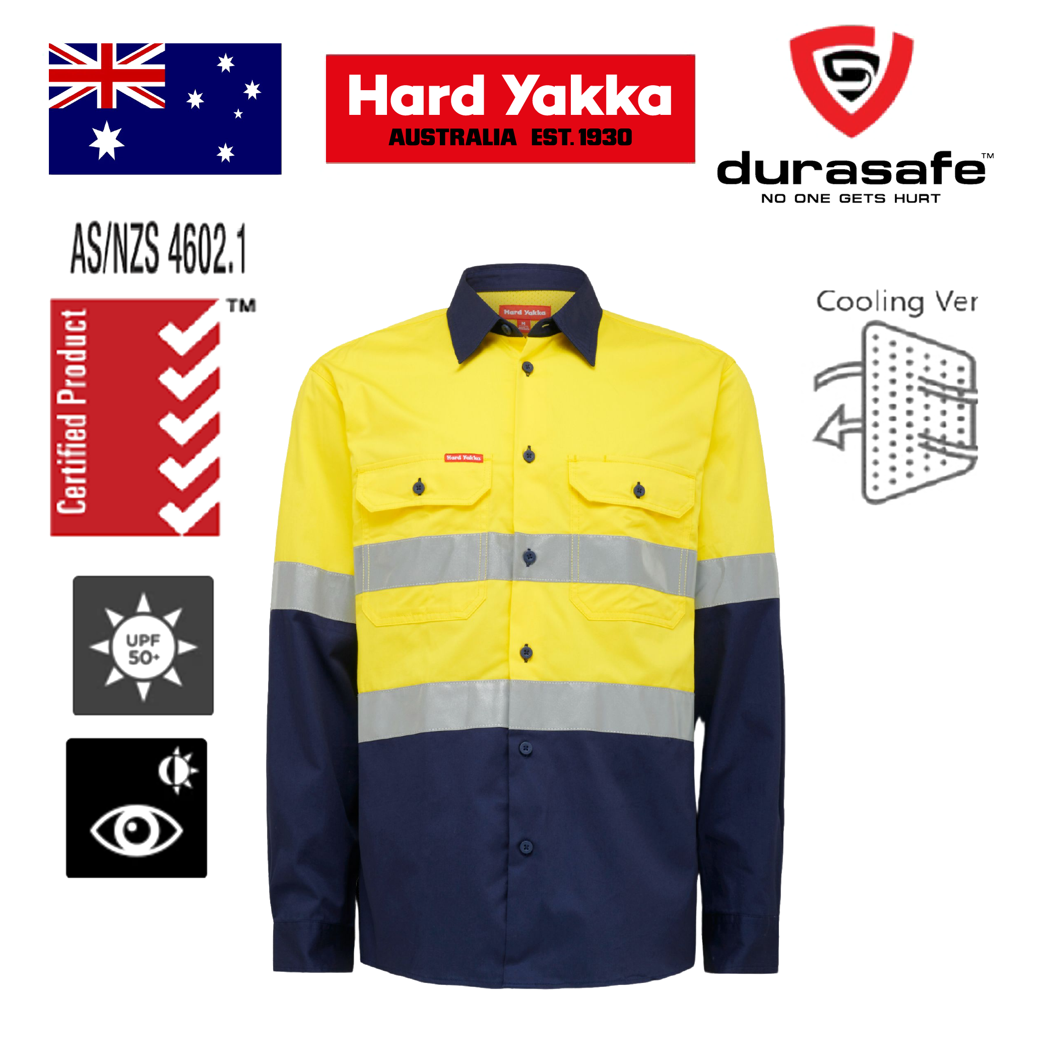HARD YAKKA Y07940 Core Men Hi Vis Light Weight 2Tone Taped L/Sleeve Shirt Yellow/Navy