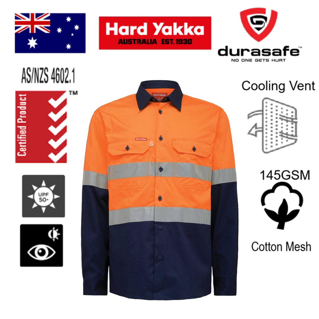 HARD YAKKA Y07940 Core Men Hi Vis Light Weight 2Tone Taped L/Sleeve Shirt Orange/Navy