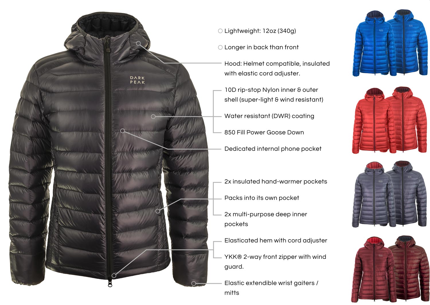 We spent 2 years designing one of the best lightweight down jackets in the world and packed it with industry-leading specs and features. 850 Fill Power Goose down gives industry leading warmth to weight and incredible compressibility. The jacket weighs just 12oz / 350g and features our proprietary, ultra-wind-resistant 10D ripstop nylon shell fabric and a drop-back design.