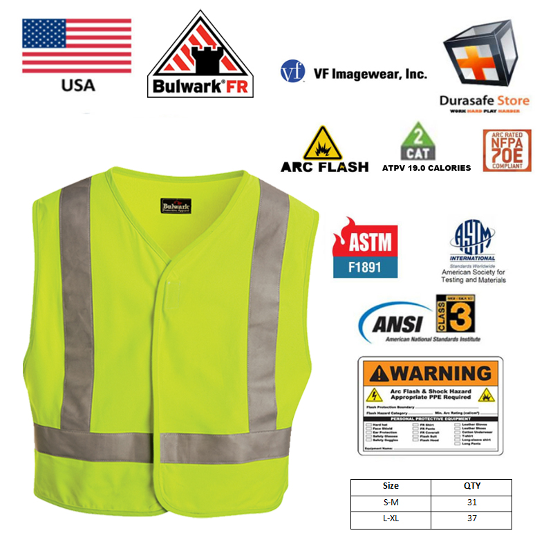 Be seen. Be safe. Enhances worker safety, especially at night or in dimly lit conditions. • Flame-resistant, 5.75 oz. high visibilty 95% Modacrylic®/5% aramid • Parallel striping, front and back • 360 degree visibility • Applied 2″ FR silver reflective striping • Hook and loop front closure • Hook and loop adjustable sides (dual sizing) • Arc rating ATPV 5.5 calories/cm2 • ASTM F2302-08 standard performance specification for labeling protective clothing as heat and flame resistant • Complies with NFPA 70E (2009 Edition)  standard for electrical safety in the workplace • ANSI 107-2004 Class 2 Level 2 Compliant